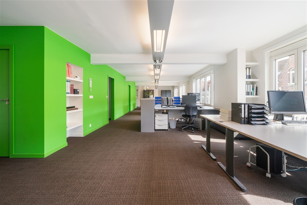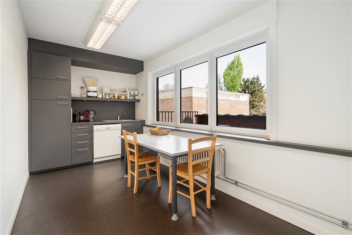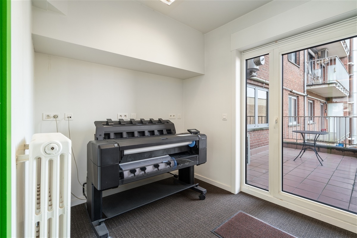 - 1ste verdieping: bureaus, archief, printerlokaal en geïnstalleerde keuken uitgerust met enkelvoudige gootsteen, vaatwas, koelkast en kastruimte. Op deze verdieping is tevens een noord georiënteerd terras.