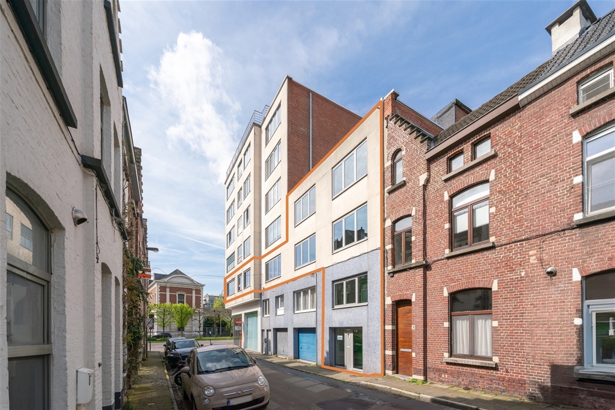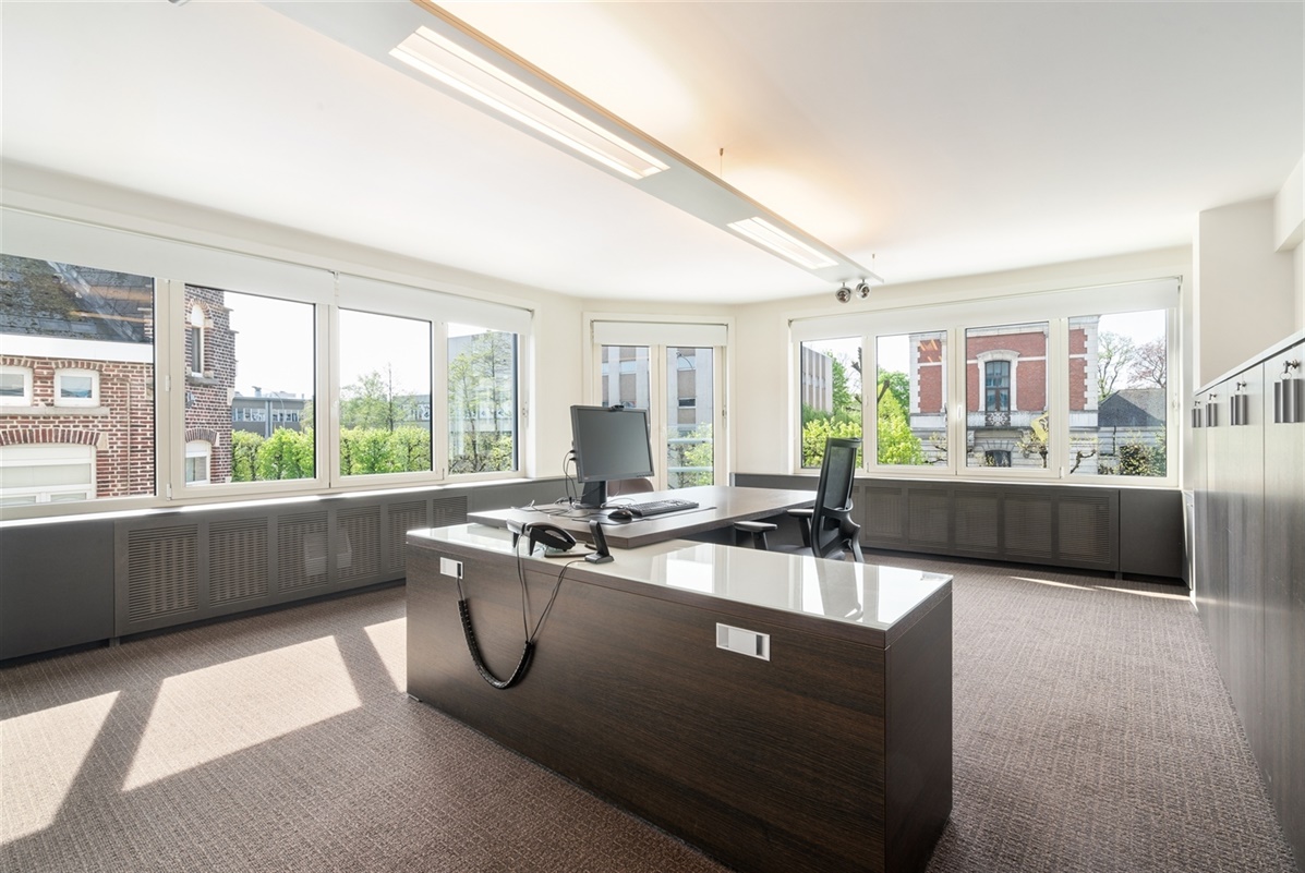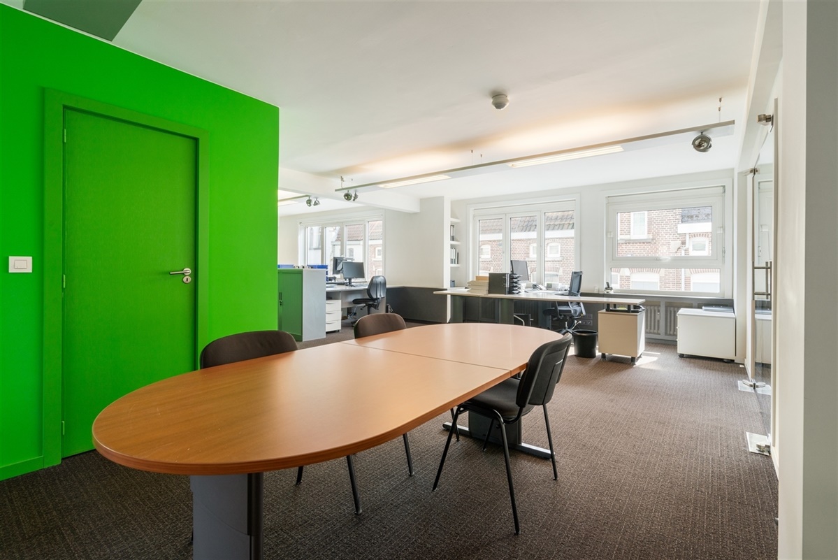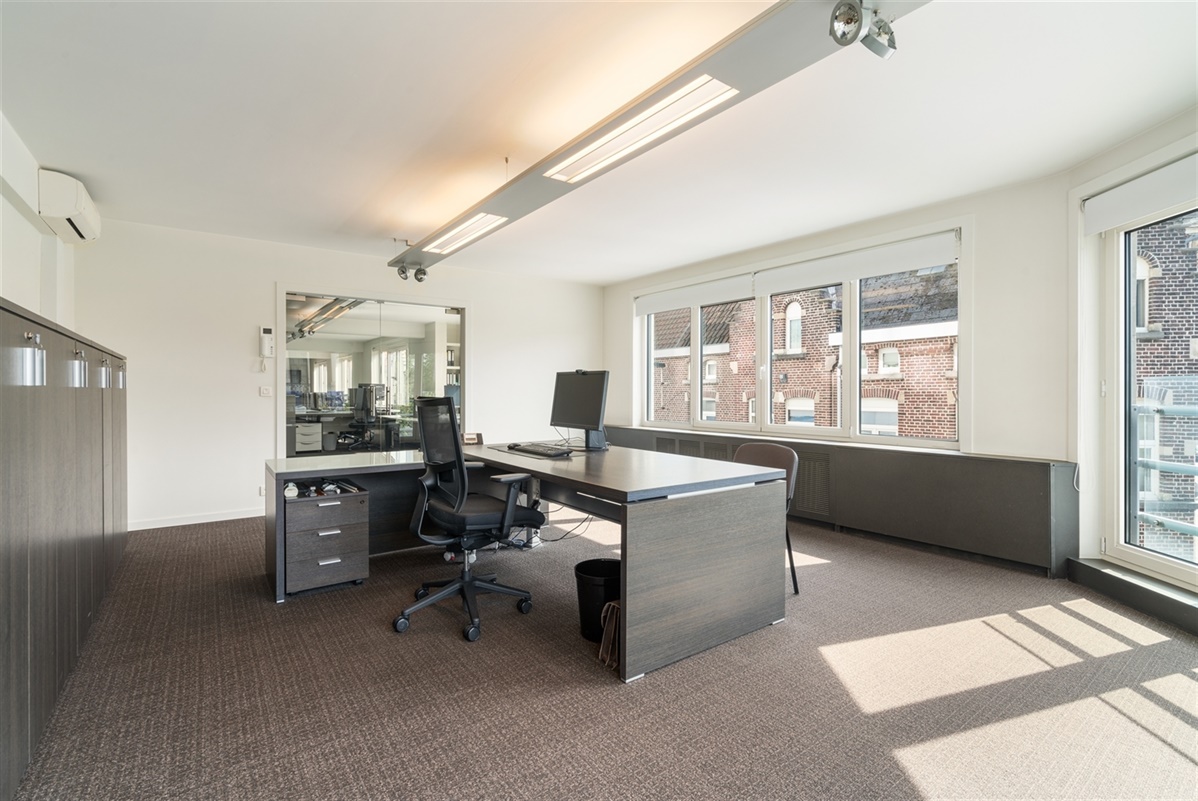 - 1ste verdieping: bureaus, archief, printerlokaal en geïnstalleerde keuken uitgerust met enkelvoudige gootsteen, vaatwas, koelkast en kastruimte. Op deze verdieping is tevens een noord georiënteerd terras.