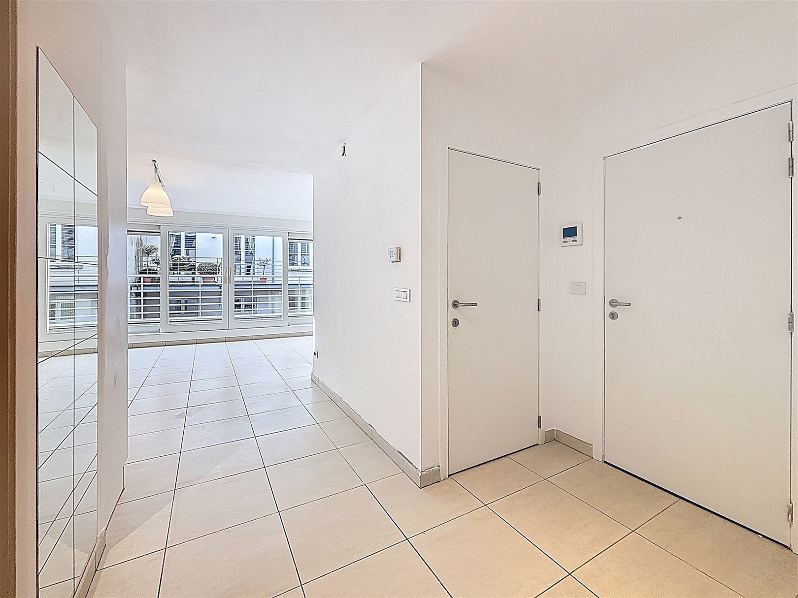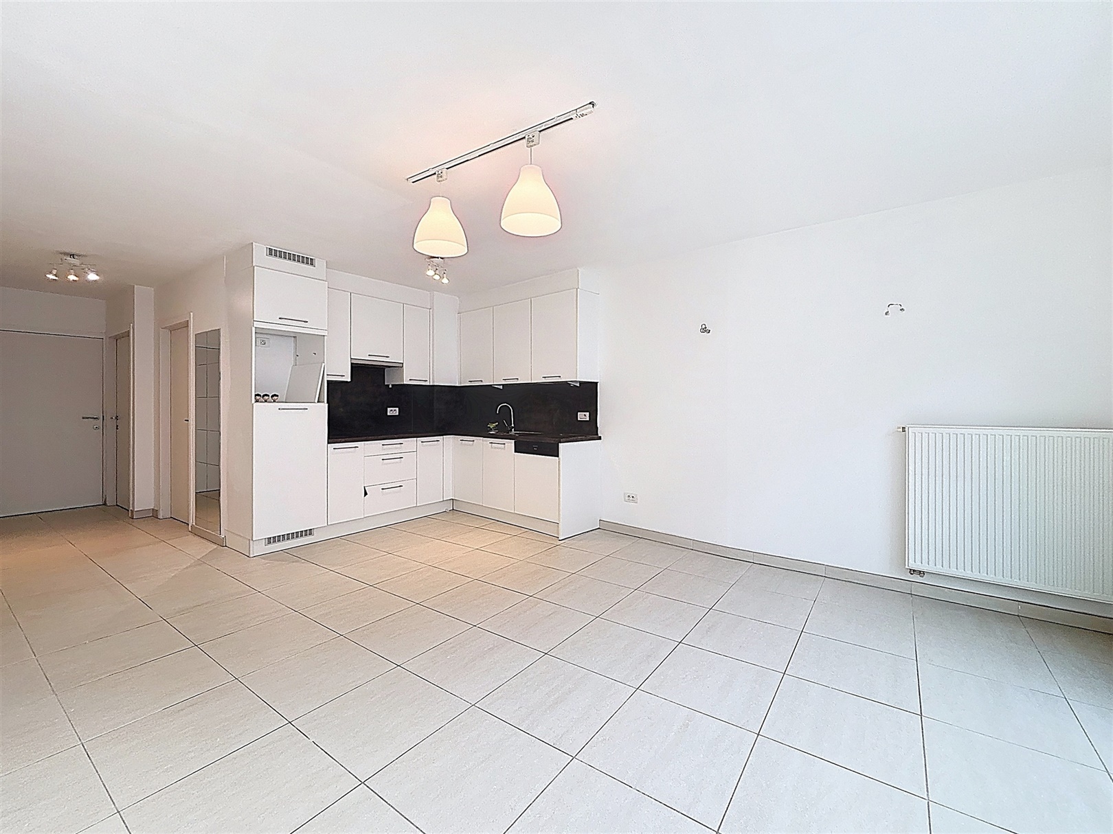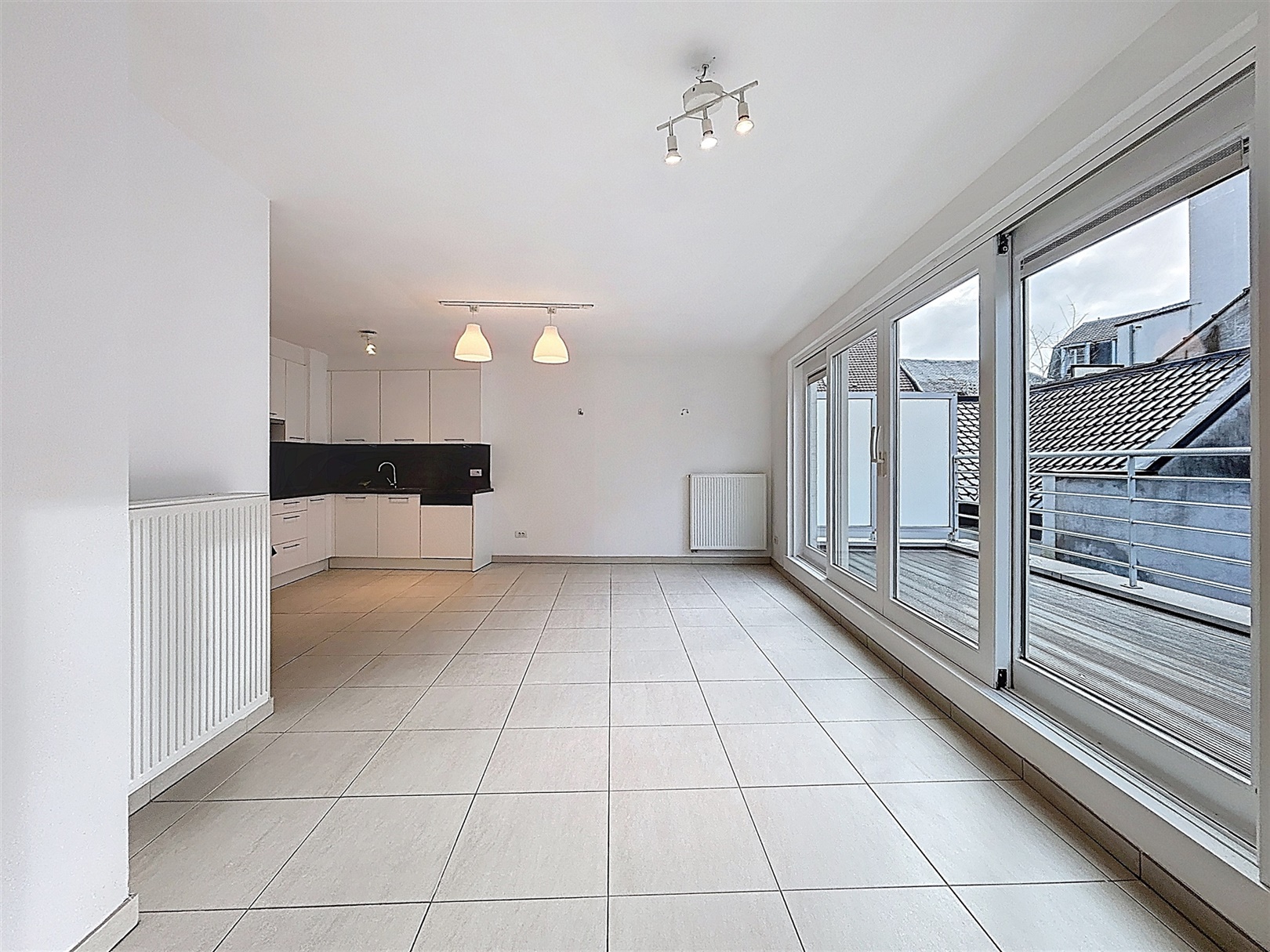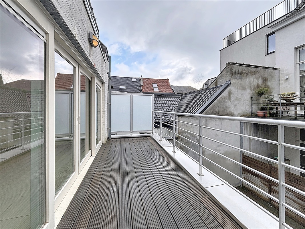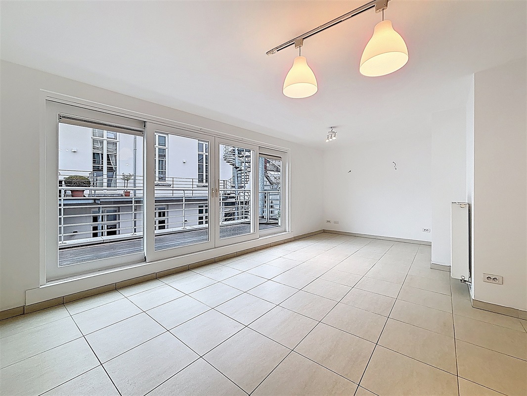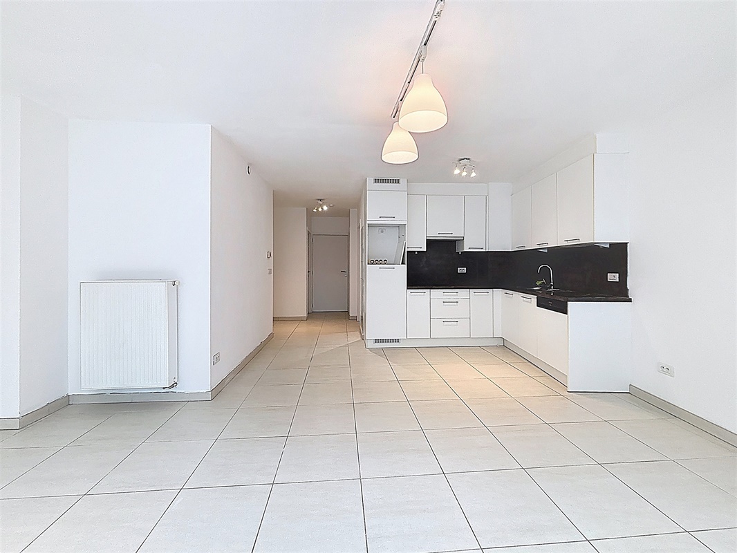 Aan de rechterzijde van het appartement bevindt zich de ruime en lichtrijke leefruimte met open keuken (42 m²). Aansluitend aan de leefruimte vindt u een ruim terras van 10 m² waar u de hele dag van de zon kan genieten. De keuken is volledig uitgerust met een koelkast, vaatwasser, kookplaat, dampkap en spoelbak, alle comfort is aanwezig.