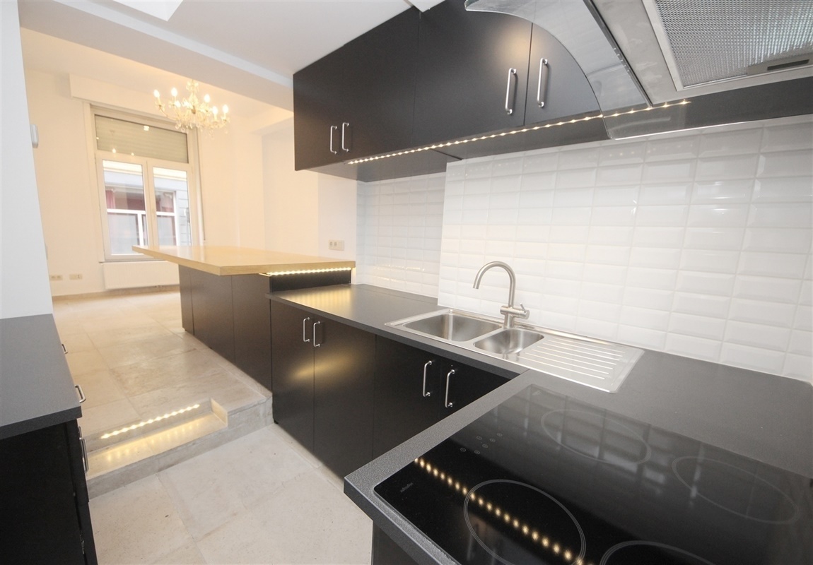 U komt de woning binnen in de ruime inkomhal die toegang verleent tot de lichtrijke leefruimte met antieke vloer, en tot de keuken met vitrokeramische kookplaten, een oven en ruime opbergkasten. Tevens is er ook aansluiting mogelijk voor een vaatwasmachine.