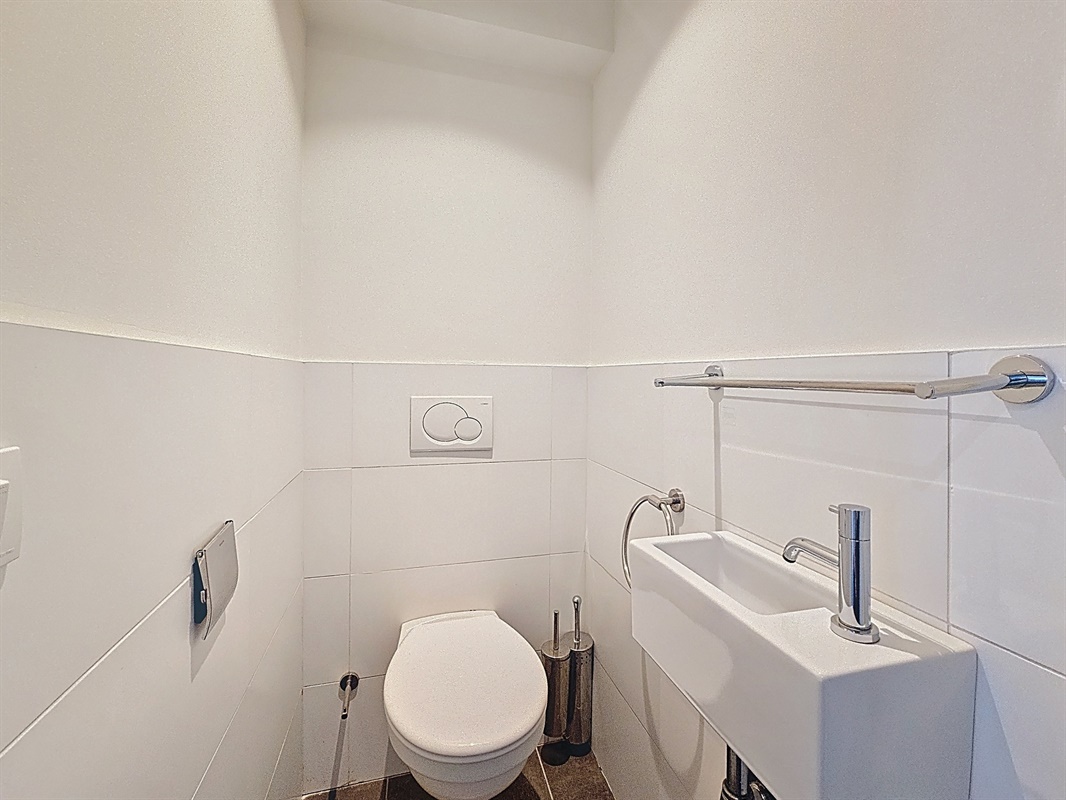 De zonnige leef- en eetruimte (47m²) met open keuken, uitgerust met een dubbele spoelbak, vaatwasser, dampkap, oven, kookplaat en koelkast. Vanuit de leefruimte heeft u rechtstreeks toegang tot het aangename terras. Verder is er een praktische berging met aansluiting voor een wasmachine en een gastentoilet